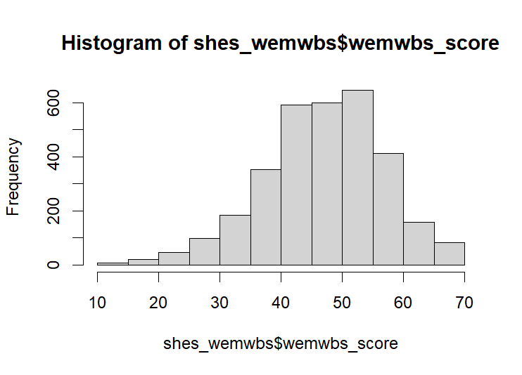 hist(shes_wemwbs$wemwbs_score) # check with a histogramOr, seeing as our variables are labelled in a logical way, a more efficient way to do the same thing would something like: