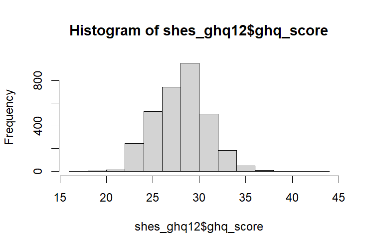 hist(shes_ghq12$ghq_score)This can be reduced down, but I’d feel more comfortable writing this out long hand as it makes it obvious which variables we’ve recoded.