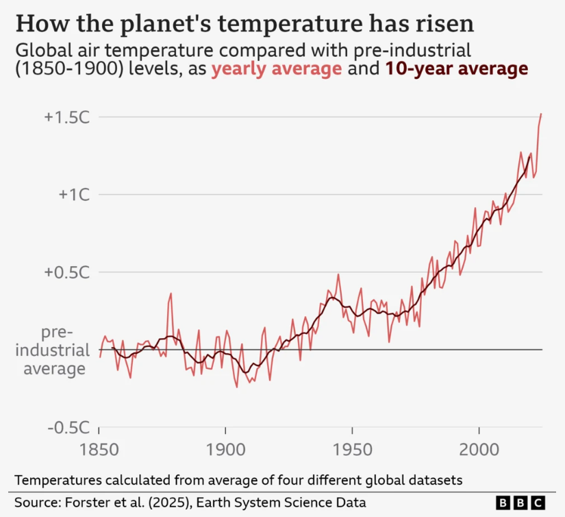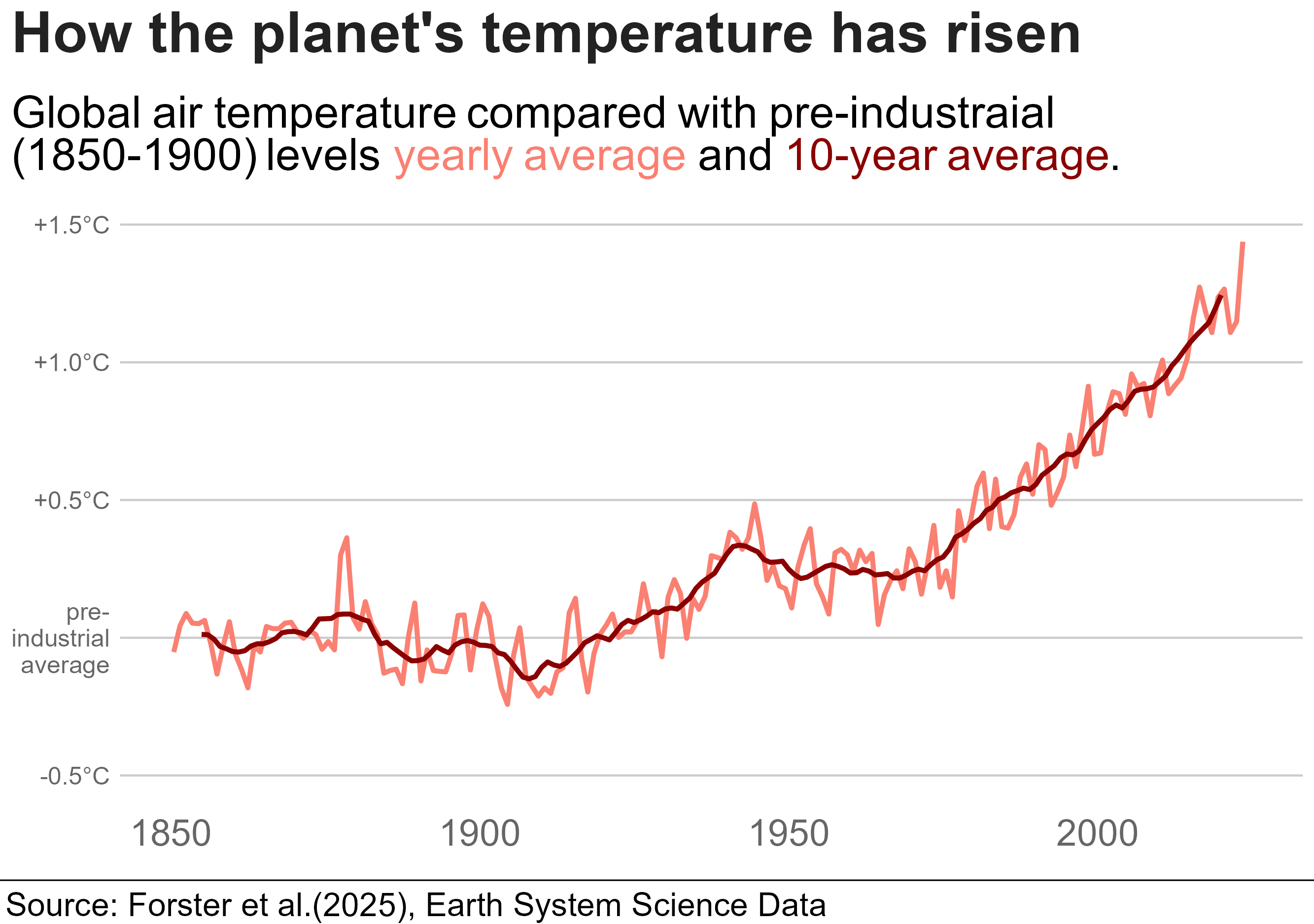 library(tidyverse)library(bbplot)library(ggrepel)library(ggtext)annual <-read_csv("annual_averages.csv")decadal <-read_csv("decadal_averages.csv")subtitle_text <-"Global air temperature compared with pre-industraial <br> (1850-1900) levels <span style='color:salmon;'>yearly average</span> and <span style='color:darkred;'>10-year average</span>."plot2 <-ggplot() +geom_line(data = annual, aes(x=time, y=GMST), colour ="salmon", linewidth =1.15)+geom_line(data = decadal, aes(x=time, y=GMST), colour ="darkred",linewidth =1.15)+labs(title ="How the planet's temperature has risen",subtitle = subtitle_text,x ="GDP per Capita (log scale recommended)",y ="Life Expectancy (Years)") +scale_y_continuous(limits =c(-0.5, 1.5),breaks =c(-0.5, 0, 0.5, 1.0, 1.5),labels =c("-0.5°C", "pre-\nindustrial\n average", "+0.5°C","+1.0°C","+1.5°C"))+bbc_style()+theme(plot.title =element_text(size =28),plot.subtitle =element_markdown(size =22),axis.text.y =element_text(size =12, colour ="grey40"),axis.text.x =element_text(size =18, colour ="grey40"))finalise_plot(plot_name = plot2,source ="Source: Forster et al.(2025), Earth System Science Data",save_filepath ="three years left.png",width_pixels =640,height_pixels =450)
