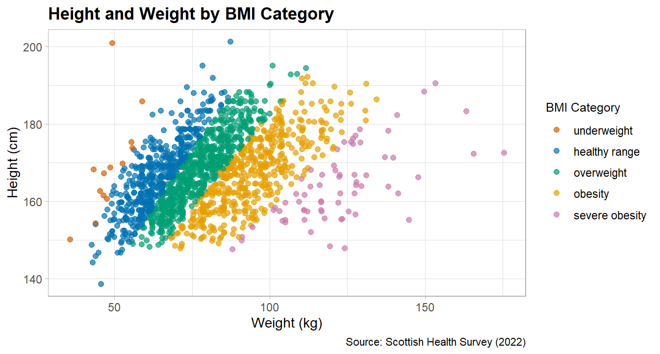 # fancy plotcolours <-c("underweight"="#D55E00","healthy range"="#0072B2","overweight"="#009E73","obesity"="#E69F00","severe obesity"="#CC79A7")# this reorders the catagories, to make the legend order correct# we'll be doing this more next week for logictic regressionshes_BMI <- shes_BMI %>%filter(!is.na(bmi_band)) %>%# this line removed the NAsmutate(bmi_band =factor(bmi_band,levels =c("underweight", "healthy range", "overweight", "obesity", "severe obesity")))shes_BMI %>%ggplot(aes(x = weight_kg_self_adj, y = height_cm_self_adj, colour = bmi_band)) +geom_point(alpha =0.7, size =2) +scale_colour_manual(values = colours,name ="BMI Category") +labs(x ="Weight (kg)", y ="Height (cm)", title ="Height and Weight by BMI Category",caption ="Source: Scottish Health Survey (2022)") +theme_light() +theme(legend.title =element_text(size =10),legend.text =element_text(size =9),plot.title =element_text(size =14, face ="bold"),axis.title =element_text(size =11),axis.text =element_text(size =9))