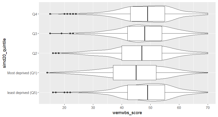 There are a number of ways that we could visualise how wellbeing (WEMEBS) differs across levels of deprivation (SIMD). Personaly, I like a box plot with a violin plot to demonstrate the distribution.