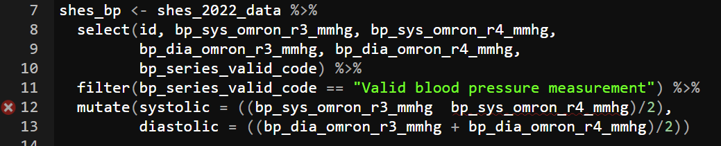 Our first step is to tidy up our blood pressure variables in the same way as we did in the last session. See if you can identify and adapt the correct code and create the systolic and diastolic blood pressure variables. No need to worry about MAP for this part of the exercise.