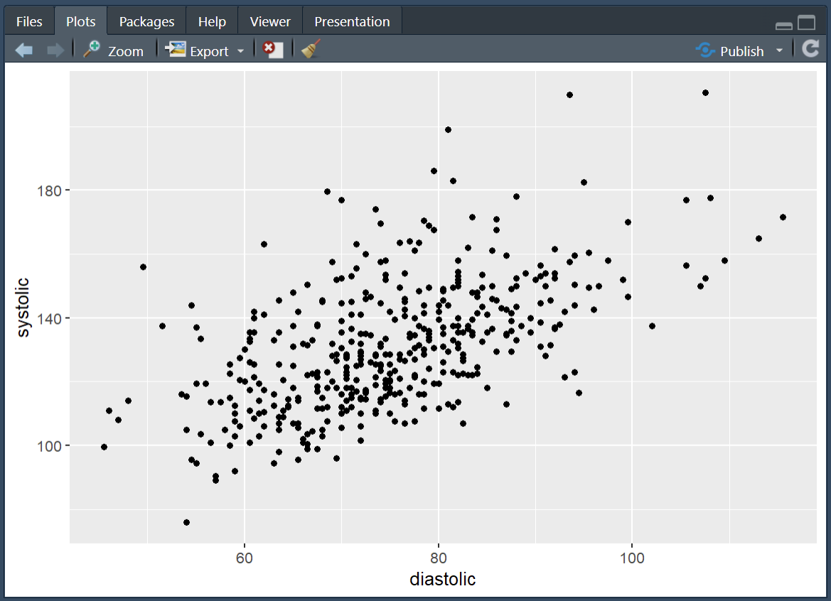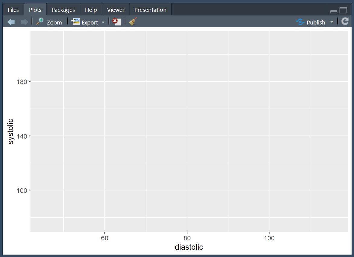 Running the above sets the aesthetic so that we now have our diastolic variable set to the x-axis and our systolic variable set to the y-axis.