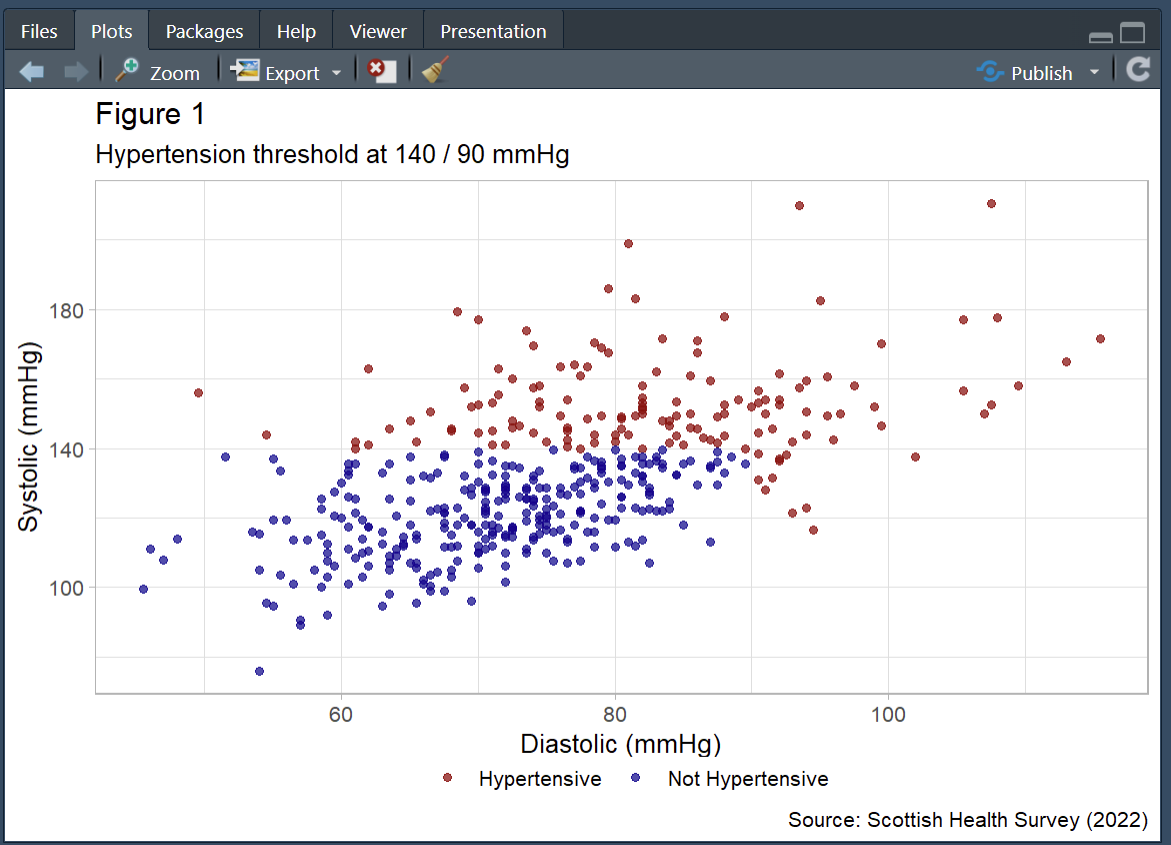 ---title: "Session 3"number-sections: false # no chapter/section numbers on this pagetoc: TRUE # (optional) hide the on-page TOCeditor_options: chunk_output_type: console---```{r}#| label: setup#| include: falsesource("R/global-setup.R")```# Data visulisation with ggplot## IntroductionThis week, I want to introduce you to the data visualisation package `ggplot2` (which is contained within the `tidyverse` package). `ggplot` is an incredibly versatile way of creating graphs and has become the standard throughout academic publishing, industry, and data journalism (see bonus section at end of page for more on this last use case).As with previous sessions we will be using your assignment dataset and, seeing as it's a new session, it's a good idea to go though our new session checklist again.Please go ahead and:1. Close any old scripts, clean your environment window (the little broom button) and Restart R.2. Create a new R script3. Save that script to your working directory4. Set your working directory5. Check that you are in the right working directory `list.files()`6. Load the tidyverse package `library(tidyverse)`7. Read in your data using `read_csv()`## Visualising hypertention (scatter plot)Hypertension is the chronic diagnostic label given to people with persistently high blood pressure. Someone with hypertension can be symptomless for years, but may be at increases the risk of heart disease, stroke, kidney disease and vascular dementia. For most adults, readings are considered high if they’re 140/90 mmHg or higher in clinic, or 135/85 mmHg or higher at home (see [white coat effect](https://en.wikipedia.org/wiki/White_coat_hypertension)). Diagnosis isn’t made on a single reading; it’s typically confirmed with 24-hour ambulatory monitoring or a series of home readings. Very high values (e.g., around 180/120 mmHg) warrant urgent clinical assessment.In this session, we’ll use the simple clinic threshold of 140/90 mmHg to define a “hypertension” category. Then we'll plot systolic and diastolic blood pressure to see what that diagnosis looks like in real terms. ### Wrangling blood pressure dataOur first step is to tidy up our blood pressure variables in the same way as we did in the last session. See if you can identify and adapt the correct code and create the systolic and diastolic blood pressure variables. No need to worry about MAP for this part of the exercise.Then we need to process the data using the `mutate()` with a `case_when()` function to turn the two continuous BP variables into a single categorical variable that tell us if the person is hypertensive or not.As mentioned above, hypertension is to be defined as a systolic reading higher than `140` **or** a diastolic reading higher than `90`. ::: {.callout-tip collapse="true"}### Solution```{r, eval=FALSE}# Step 1shes_bp <- shes_2022_data %>%select(id, bp_sys_omron_r3_mmhg, bp_sys_omron_r4_mmhg, bp_dia_omron_r3_mmhg, bp_dia_omron_r4_mmhg, bp_series_valid_code) %>%filter(bp_series_valid_code =="Valid blood pressure measurement") %>%mutate(systolic = ((bp_sys_omron_r3_mmhg + bp_sys_omron_r4_mmhg)/2),diastolic = ((bp_dia_omron_r3_mmhg + bp_dia_omron_r4_mmhg)/2))# Step 2shes_bp <- shes_bp %>%mutate(bp_cat =case_when(systolic >=140| diastolic >=90~"hypertensive", systolic <140| diastolic <90~"not hypertensive",TRUE~NA_character_))```Due to there only being two categories another way to solve step to would be with an `if_else` statement.`r webexercises::hide("if_else()")````{r, eval=FALSE}shes_bp <- shes_bp %>%mutate(bp_cat =if_else(systolic >=140& diastolic >=90, "hypertensive","not hypertensive"))```The first argument in `if_else()` outlines the parameters for `TRUE`, the second argument labels for `TRUE` the third labels for `FALSE``r webexercises::unhide()`:::And final just to tidy up our dataset we can drop the variables that we don't need.```{r, eval=FALSE}shes_bp <- shes_bp %>%select(id, systolic, diastolic, bp_cat)# ORshes_bp <- shes_bp %>%select(-bp_sys_omron_r3_mmhg, -bp_sys_omron_r4_mmhg, -bp_dia_omron_r3_mmhg,-bp_dia_omron_r4_mmhg, -bp_series_valid_code)```### Plotting blood pressure dataCreating a plot with `ggplot()` requires using a set of grammar that builds up your plot layer by layer. For now the easiest way to start a graph is to pick the dataset you want to use and **pipe** that into the ggplot function. Later on you may want to represent multiple datasets on the same plot, when doing so you'll need a different grammar but for now most of your graphs will start like this:```{r, eval=FALSE}shes_bp %>%ggplot()```Running the above you'll see a blank canvas in the bottom right hand RStudio screen. This is where we'll build our plot. Adjusting this screen will change the size of the graph, so keep it to around a quarter of your overall screen so that your graph is viable and of a reasonable aspect ratio. Next, as the first argument within the `ggplot()` function we need to set out the **aesthetic**. This will tell R, which variables from our dataset will appear on our graph and where/how. To set the aesthetic we need to use the `aes()` function and then allocate a variable to the x-axis and a variable to the y-axis. ```{r,eval=FALSE}shes_bp %>%ggplot(aes(x = diastolic, y = systolic))```Running the above sets the aesthetic so that we now have our `diastolic` variable set to the x-axis and our `systolic` variable set to the y-axis. Next we need to add another layer to our plot. To do this we use a `+` and hit return so that the next layer starts on the following line (note: its `+` not `%>%` when working on a `ggplot()`, but they both basically mean: **and then**) And finally, to make the most basic version of a plot, we can layer on top a **geometry**, this is the type of graph that we would like to make. In this case we will use `geom_point()` which gives us the geometry of a scatter plot. ```{r,eval=FALSE}shes_bp %>%ggplot(aes(x = diastolic, y = systolic)) +geom_point()```Running the above gives us a scatter pl