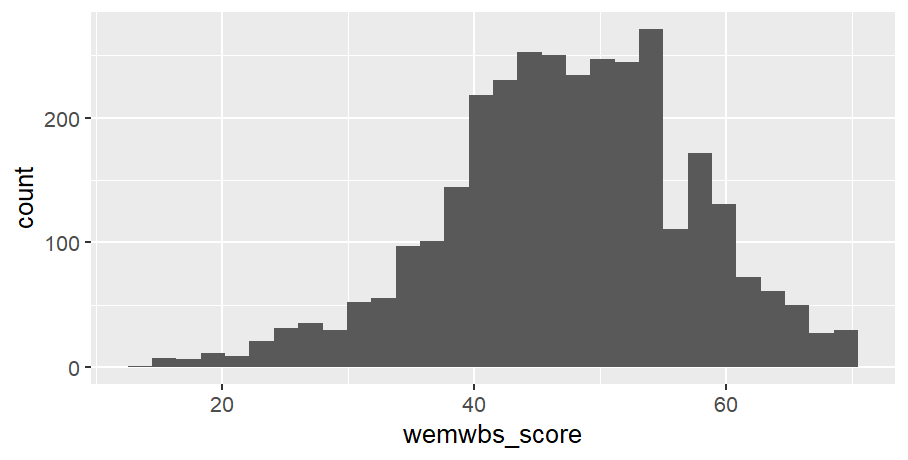 If you completed the exercises for session 1 you have already done the majority of the wrangling here. The WEMWBS has 14 items to it. To turn the 14 items into a wellbeing score (where higher is greater wellbeing) all we need to do is add the items together.