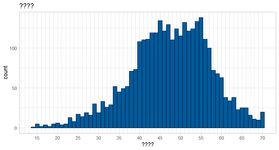 wemebs_simd_data %>%ggplot(aes(x = wemwbs_score)) +geom_histogram(binwidth =1, colour ="black", fill ="#005A9C") +scale_x_continuous(breaks =seq(0, 70, by =5),minor_breaks =seq(0, 70, by =1)) +labs(title ="????",x ="????") +theme_light()