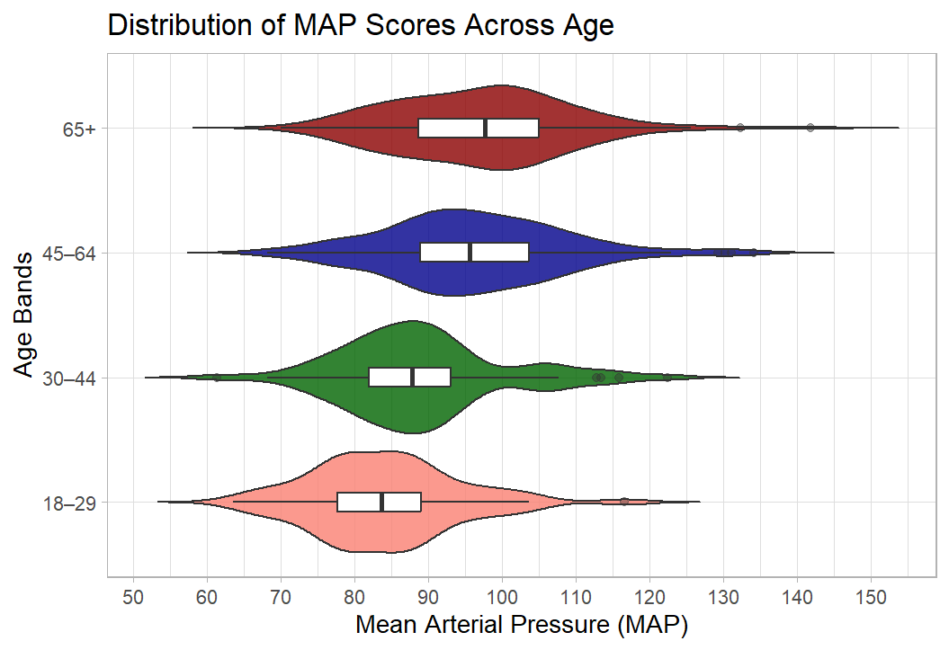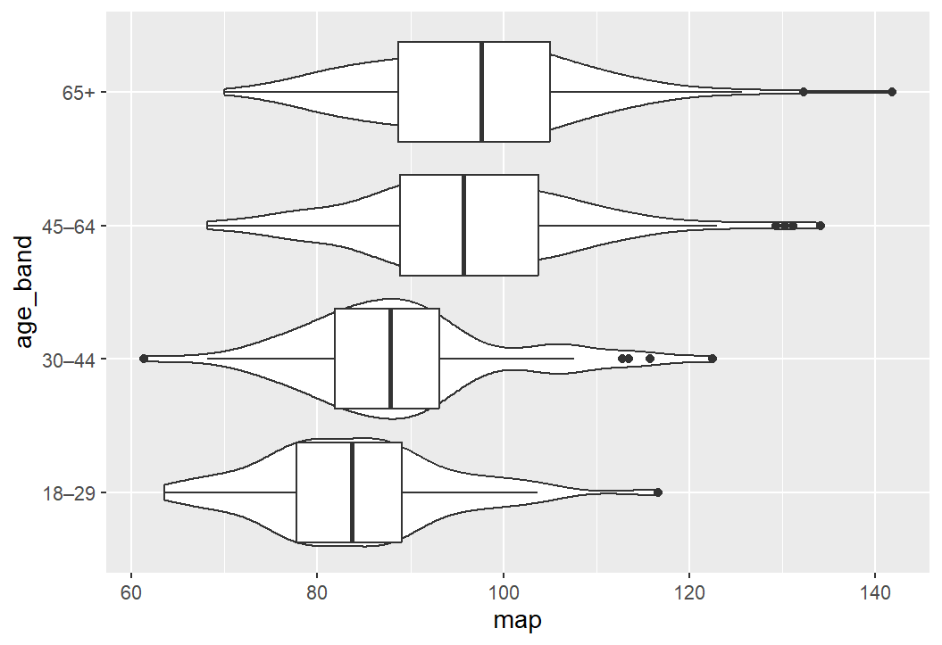shes_2022_data <-read_csv("SHeS_2022_clean.csv")# this code selects the datashes_bp_age <- shes_2022_data %>%select(id, age, bp_sys_omron_r3_mmhg, bp_sys_omron_r4_mmhg, bp_dia_omron_r3_mmhg, bp_dia_omron_r4_mmhg, bp_series_valid_code)# this code filters to include only valid measurementsshes_bp_age_valid <- shes_bp_age %>%filter(bp_series_valid_code =="Valid blood pressure measurement")# this code takes an average of the sys and dia readingsshes_bp_age_valid <- shes_bp_age_valid %>%mutate(systolic = ((bp_sys_omron_r3_mmhg + bp_sys_omron_r4_mmhg)/2),diastolic = ((bp_dia_omron_r3_mmhg + bp_dia_omron_r4_mmhg)/2))# this code calculates Mean Arterial Pressure ()shes_bp_age_valid <- shes_bp_age_valid %>%mutate(map = (systolic + (2* diastolic)) /3)# this code creates the age bandsshes_bp_age_valid <- shes_bp_age_valid %>%mutate(age_band =case_when(age <30~"18–29", age >=30& age <45~"30–44", age >=45& age <65~"45–64", age >=65~"65+",TRUE~NA_character_))# basic box and violin plot codeshes_bp_age_valid %>%ggplot(aes(x= map, y = age_band)) +geom_violin() +geom_boxplot()
